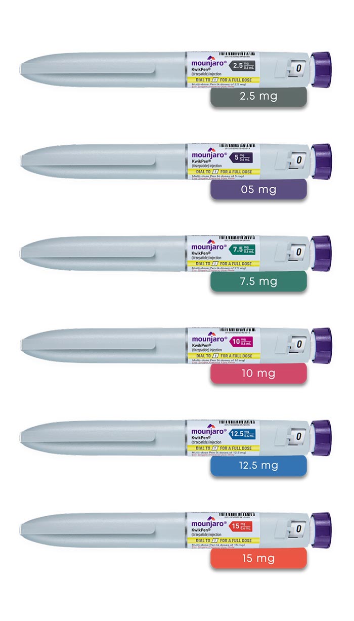 Mounjaro is a once-weekly injection with the active ingredient Tirzepatide. Each pack of Mounjaro contains one pre-filled pen. The pen contains 4 doses of Mounjaro. The pen would either contain 2.5 mg, 5 mg, 7.5 mg, 10 mg, 12.5 mg, or 15 mg.